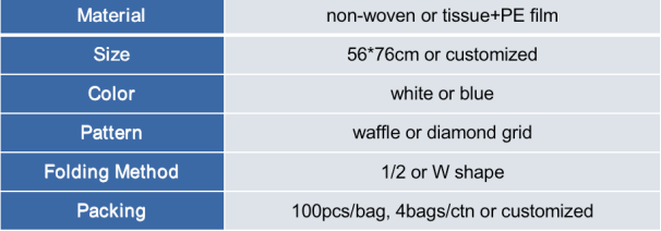 • Premium Materials – Made from soft tissue/poly or non-woven fabric with a PE film backing for durability and fluid resistance.